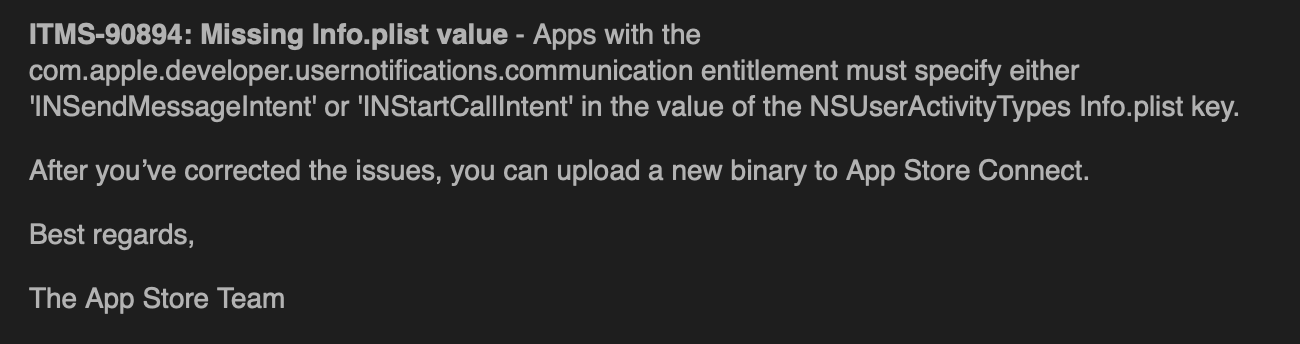 ITMS-90894: Missing Info.plist value - Apps with the com.apple.developer.usernotifications.communication entitlement must specify either 'INSendMessageIntent' or 'INStartCallIntent' in the value of the NSUserActivityTypes Info.plist key.