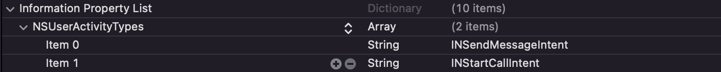 위와 같은 내용이었는데, Info.plist에 NSUserActivityTypes에 array로 INSendMessageIntent 또는 INStartCallIntent 을 추가해주면 된다.